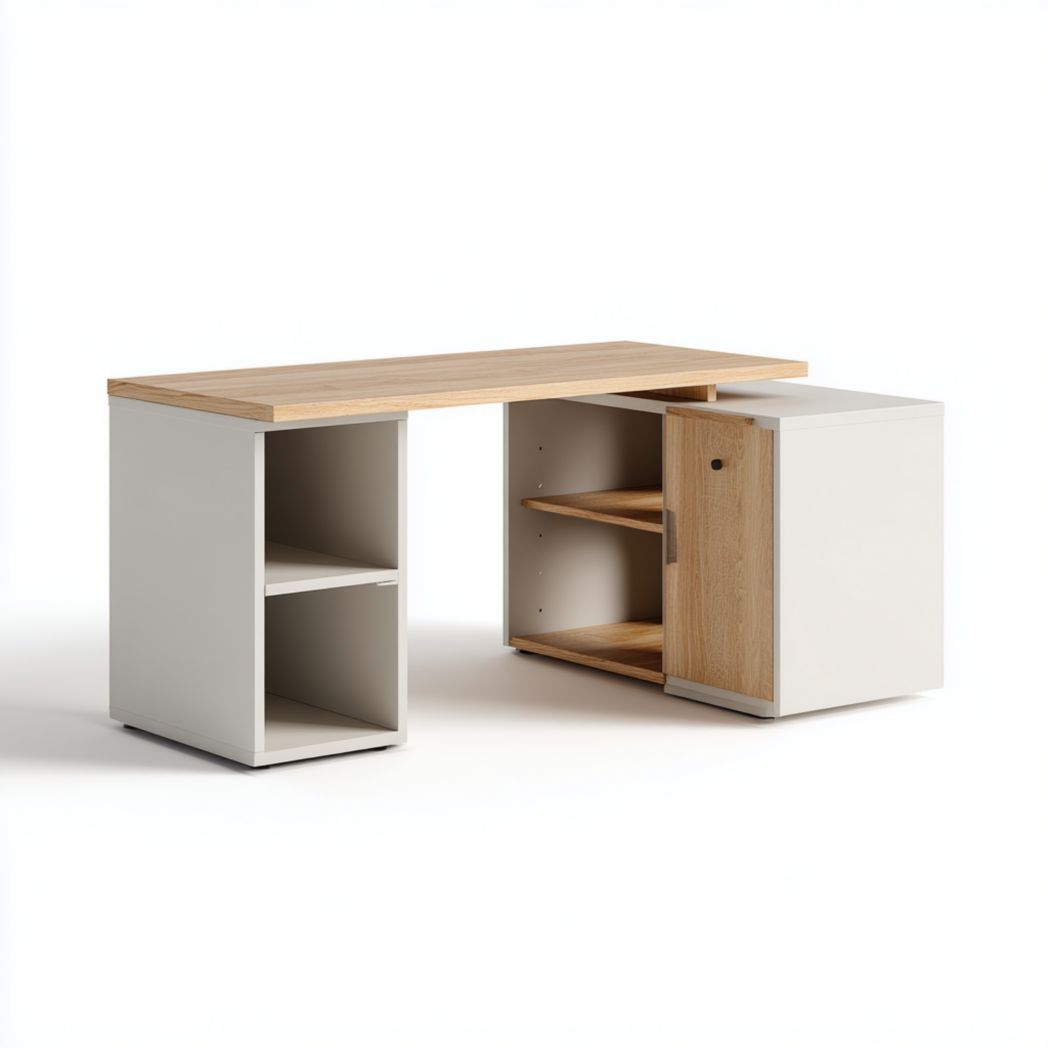 Bureau en angle avec étagères et porte de rangement, finition chêne et blanc