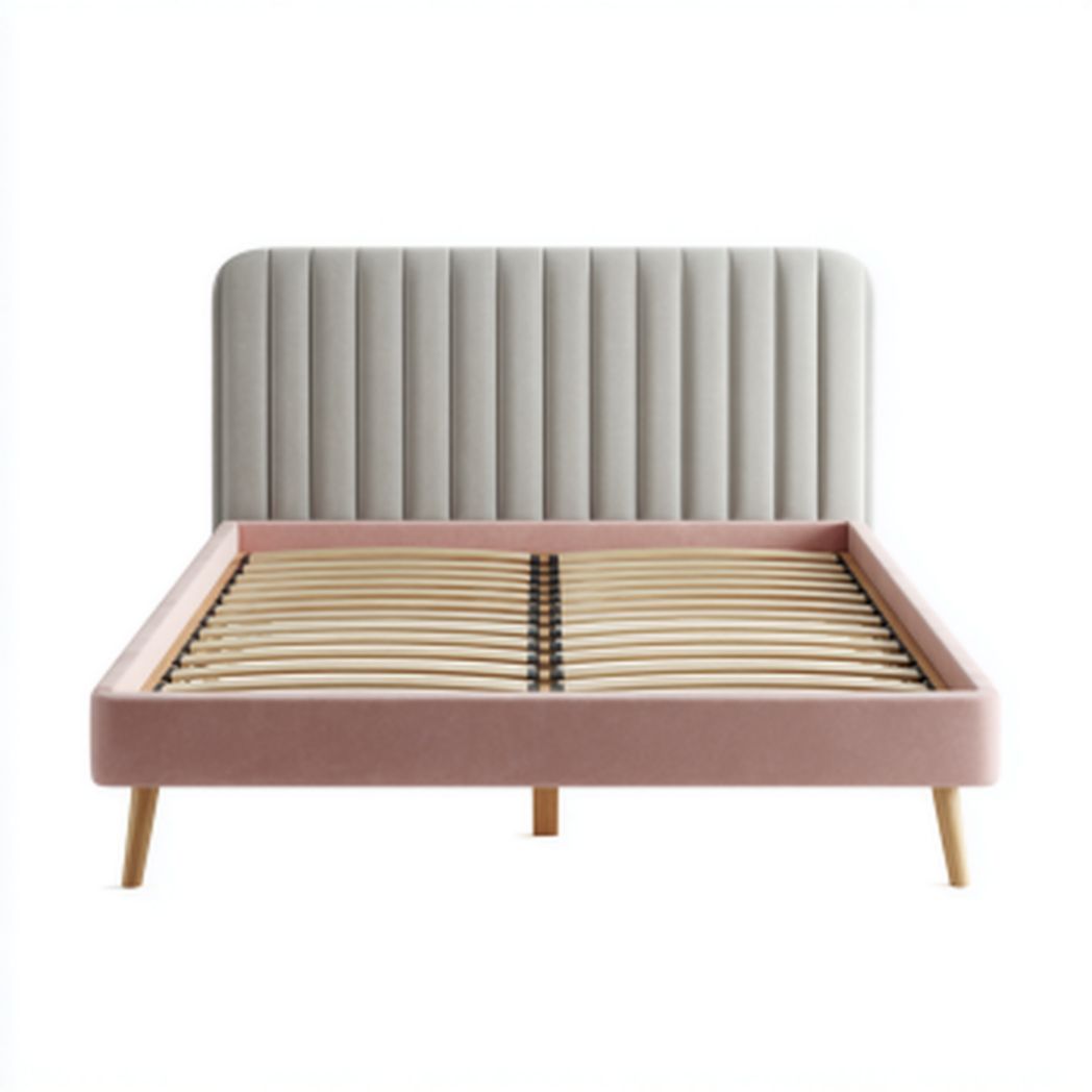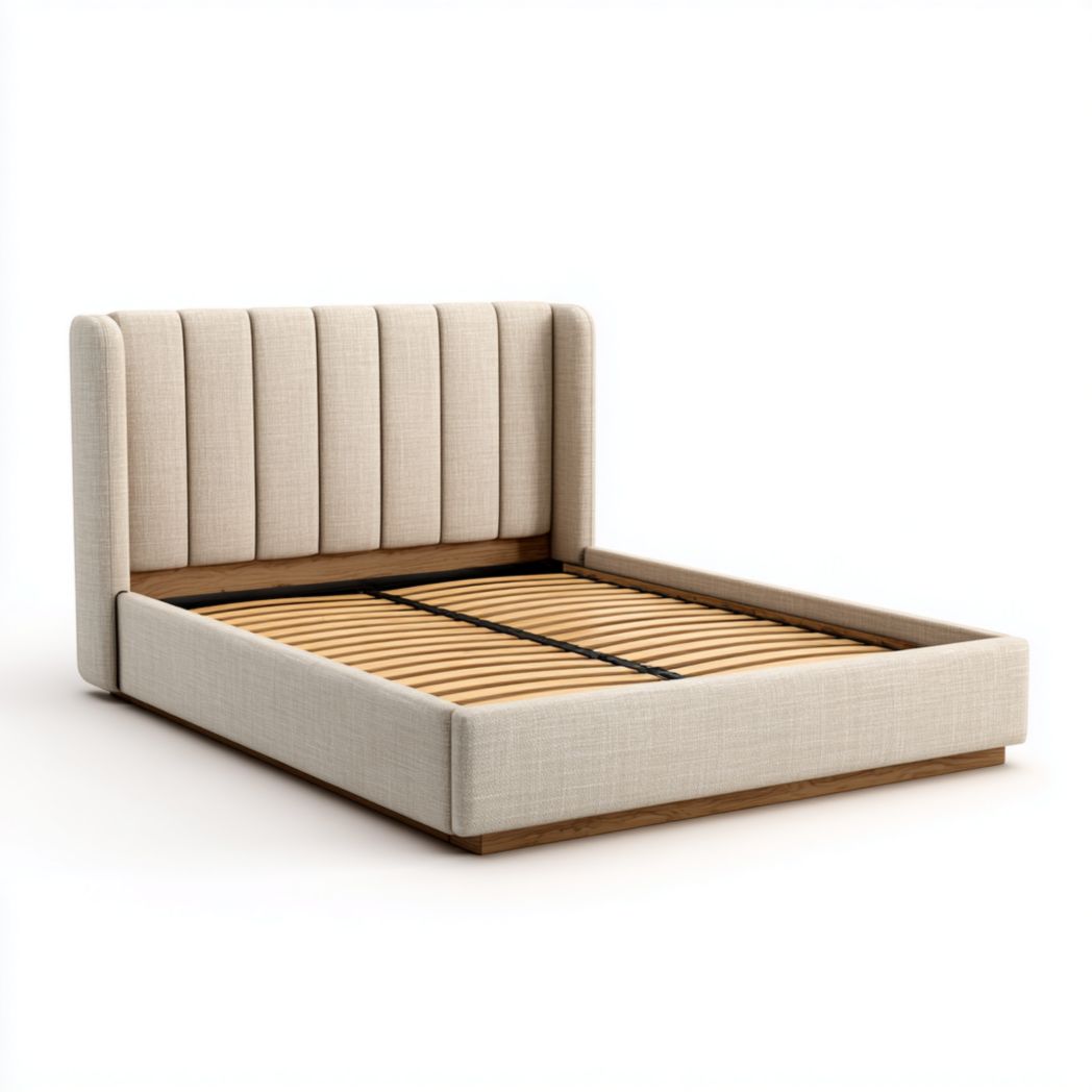Lit avec tête de lit en tissu et cadre en bois avec pieds en métal noir